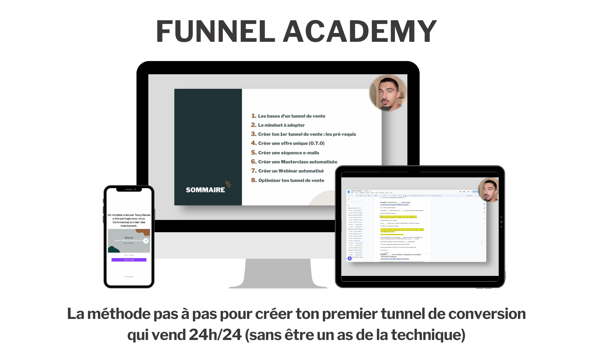 Funnel Academy est un programme découpé en 8 grands modules au format vidéo durant lesquels je te filme mon écran et te partage tout le savoir dont tu as besoin. La formation peut être suivie sur ordinateur, une tablette ou même un téléphone. Les modules sont débloqués dès l’achat.